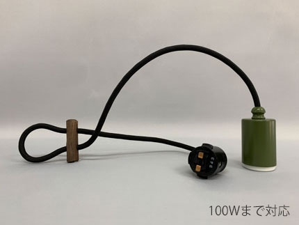 | GLF-0300GR-40DP ¥4,100(税抜) コード長さ約40.0cm・全長約51.5cm・重量約205g GLF-0300GR-70DP ¥4,300(税抜) コード長さ約70.0cm・全長約81.5cm・重量約215g ・スチール(緑塗装)・E-26モーガルソケット・黒コード・ダクトプラグ付 ・丸木自在(茶)付 |